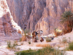 | Hier leben sie mit ihren Ziegen- und Kamelherden oder bauen in den Oasengärten Obst und Gemüse an. Nebenbei arbeiten die Männer auch im Tourismusbereich als Kamelführer oder Jeepfahrer. Jeder Stamm hat seine eigenen Kamele, die durch Brandzeichen markiert sind. Wenn die Kamele allein durch die Wüste ziehen, erkennen die Beduinen anhand dieser Kennzeichnung, zu welchem Stamm das Tier gehört. Noch heute sind die Kamele für die Beduinen wertvolle und wichtige Tiere. |